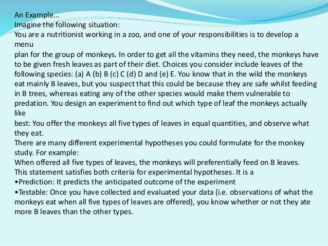 - 10. An Example… Imagine the following situation: You are a nutritionist working in a zoo, and one of your responsibilities is to develop a menu plan for the group of monkeys. In order to get all the vitamins they need, the monkeys have to be given fresh leaves as part of their diet. Choices you consider include leaves of the following species: (a) A (b) B (c) C (d) D and (e) E. You know that in the wild the monkeys eat mainly B leaves, but you suspect that this could be because they are safe whilst feeding in B trees, whereas eating any of the other species would make them vulnerable to predation. You design an experiment to find out which type of leaf the monkeys actually like best: You offer the monkeys all five types of leaves in equal quantities, and observe what they eat. There are many different experimental hypotheses you could formulate for the monkey study. For example: When offered all five types of leaves, the monkeys will preferentially feed on B leaves. This statement satisfies both criteria for experimental hypotheses. It is a •Prediction: It predicts the anticipated outcome of the experiment •Testable: Once you have collected and evaluated your data (i.e. observations of what the monkeys eat when all five types of leaves are offered), you know whether or not they ate more B leaves than the other types.