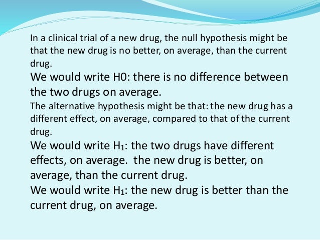 - 15. In a clinical trial of a new drug, the null hypothesis might be that the new drug is no better, on average, than the current drug. We would write H0: there is no difference between the two drugs on average. The alternative hypothesis might be that: the new drug has a different effect, on average, compared to that of the current drug. We would write H1: the two drugs have different effects, on average. the new drug is better, on average, than the current drug. We would write H1: the new drug is better than the current drug, on average.
