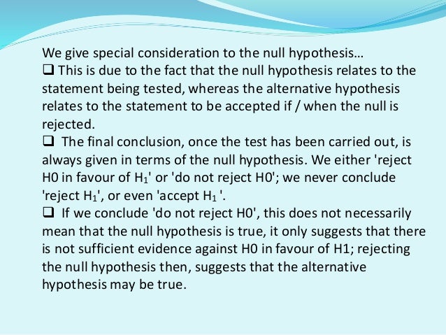 - 16. We give special consideration to the null hypothesis… This is due to the fact that the null hypothesis relates to the statement being tested, whereas the alternative hypothesis relates to the statement to be accepted if / when the null is rejected. The final conclusion, once the test has been carried out, is always given in terms of the null hypothesis. We either 'reject H0 in favour of H1' or 'do not reject H0'; we never conclude 'reject H1', or even 'accept H1 '. If we conclude 'do not reject H0', this does not necessarily mean that the null hypothesis is true, it only suggests that there is not sufficient evidence against H0 in favour of H1; rejecting the null hypothesis then, suggests that the alternative hypothesis may be true.