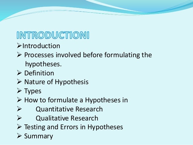 - 2. Introduction Processes involved before formulating the hypotheses. Definition Nature of Hypothesis Types How to formulate a Hypotheses in Quantitative Research Qualitative Research Testing and Errors in Hypotheses Summary