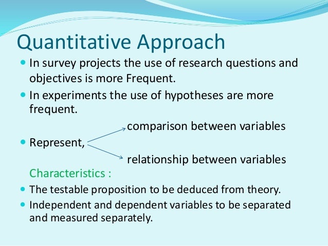 - 22. Quantitative Approach In survey projects the use of research questions and objectives is more Frequent. In experiments the use of hypotheses are more frequent. comparison between variables Represent, relationship between variables Characteristics : The testable proposition to be deduced from theory. Independent and dependent variables to be separated and measured separately.