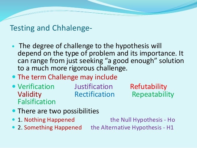 - 28. Testing and Chhalenge- The degree of challenge to the hypothesis will depend on the type of problem and its importance. It can range from just seeking “a good enough” solution to a much more rigorous challenge. The term Challenge may include Verification Justification Refutability Validity Rectification Repeatability Falsification There are two possibilities 1. Nothing Happened the Null Hypothesis - Ho 2. Something Happened the Alternative Hypothesis - H1