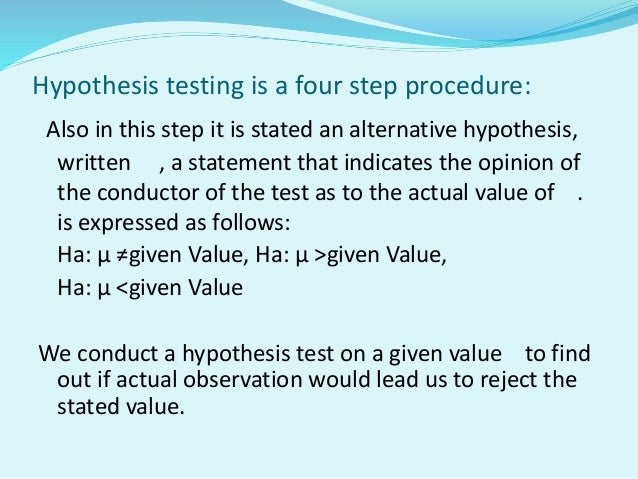 - 33. Hypothesis testing is a four step procedure: Also in this step it is stated an alternative hypothesis, written , a statement that indicates the opinion of the conductor of the test as to the actual value of . is expressed as follows: Ha: µ ≠given Value, Ha: µ >given Value, Ha: µ