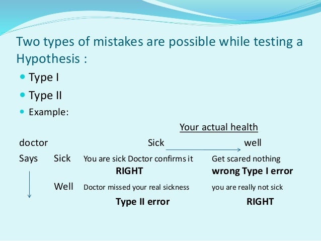 - 34. Two types of mistakes are possible while testing a Hypothesis : Type I Type II Example: Your actual health doctor Sick well Says Sick You are sick Doctor confirms it Get scared nothing RIGHT wrong Type I error Well Doctor missed your real sickness you are really not sick Type II error RIGHT